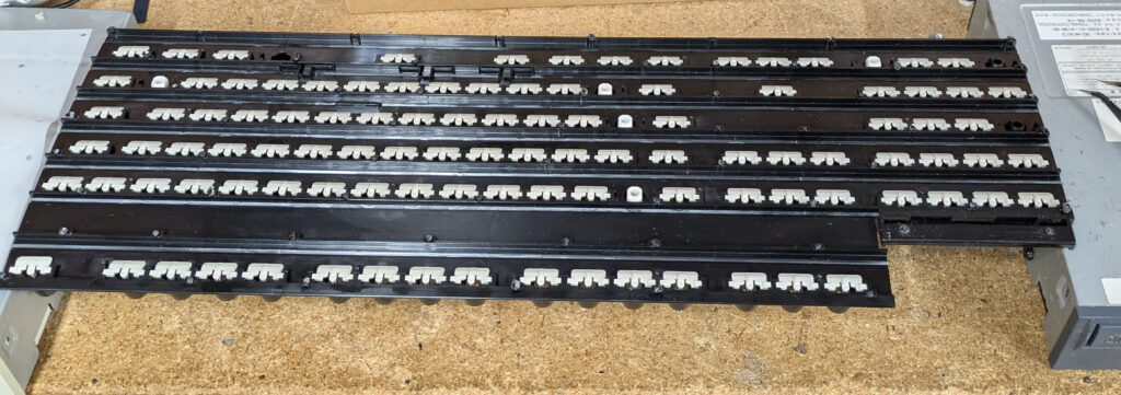 This is a process very commonly documented online, but not something I had done before. In short, the whole barrel plate is fixated with plastic rivets to the backplate, sandwiching the membrane layers in between. To take it apart, you must first remove every key, then pop the plastic rivets, freeing each part. You must be very careful to keep the barrel plate upside-down! If you turn it over, ALL of the hammers will fall out, leaving you with an even more tedious reassembly project.