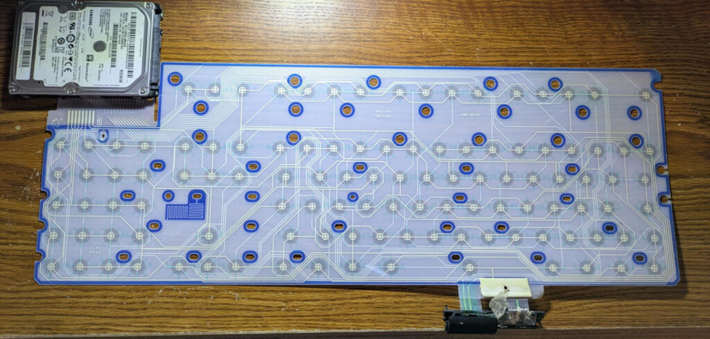 As you’ll see here, the mouse buttons themselves are wired thru the very same membrane that hosts the keys. When I reassemble, I will simply hot glue this part of the membrane sheet over the back of the metal backplate, to completely get it out of the way and prevent any unintentional activation of the buttons.