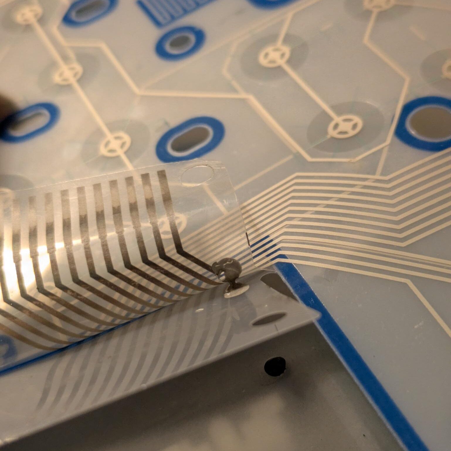 To resolve this, we must gain access to the very wiring itself. At least in this use case, the membrane sheet folds over an insulation layer, which you could say is sandwiched in between. These layers are VERY thin and delicate – it relies on very small tolerances. Be careful! There is adhesive that must be split thru – you want to take great care NOT to tear the connection between, you’re only trying to separate it so that you can lay everything flat and unfolded.