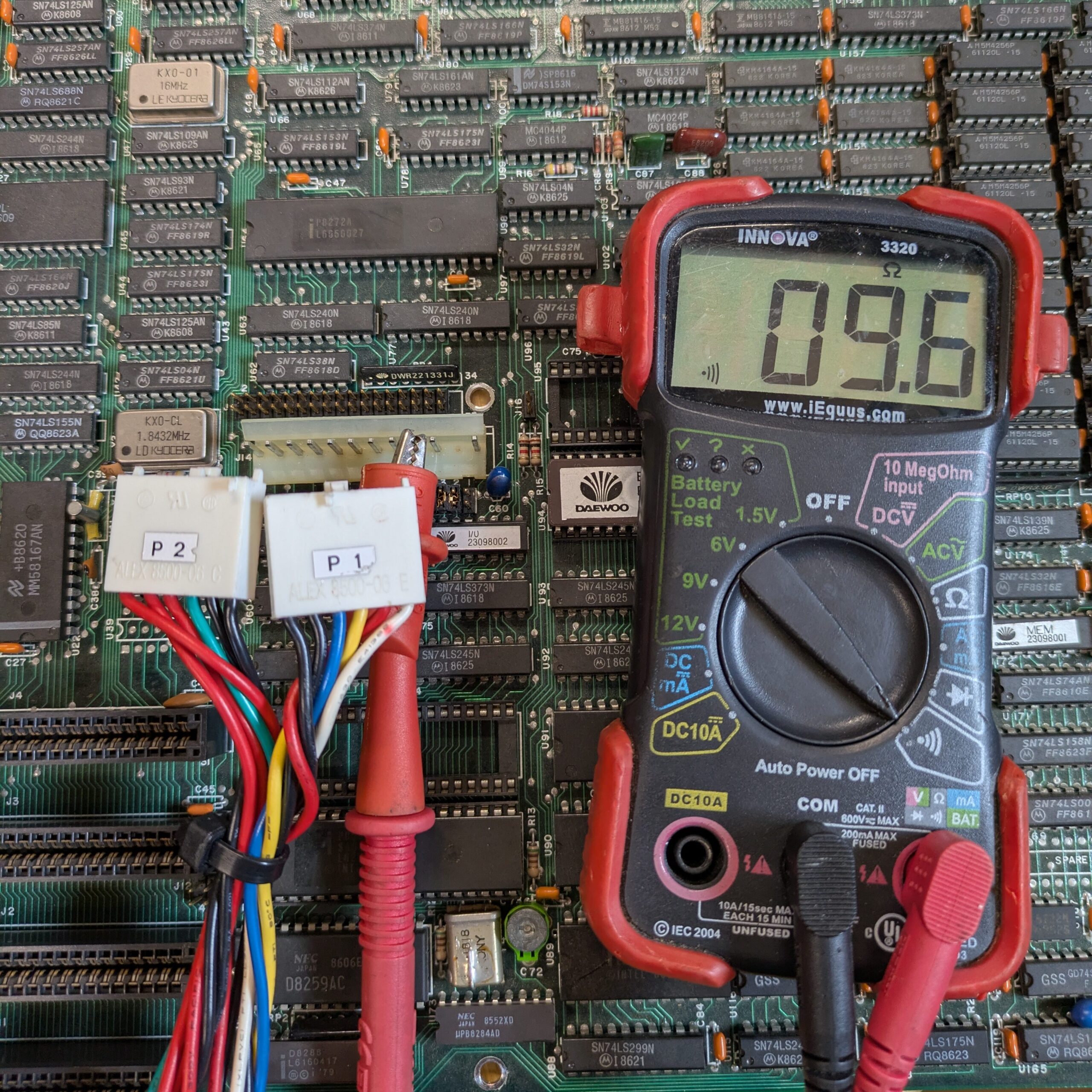 I broke out my multimeter, and I found the problem – an entire power rail is shorted to ground! With one meter probe hooked to the board’s metal grounding area and another onto the +12V pin of the motherboard, I get a reading of a bit shy of 10 ohms! None of the other voltage rails are that way, so that definitely seems like an issue. (And on the other one, the +5V rail is shorted instead!)