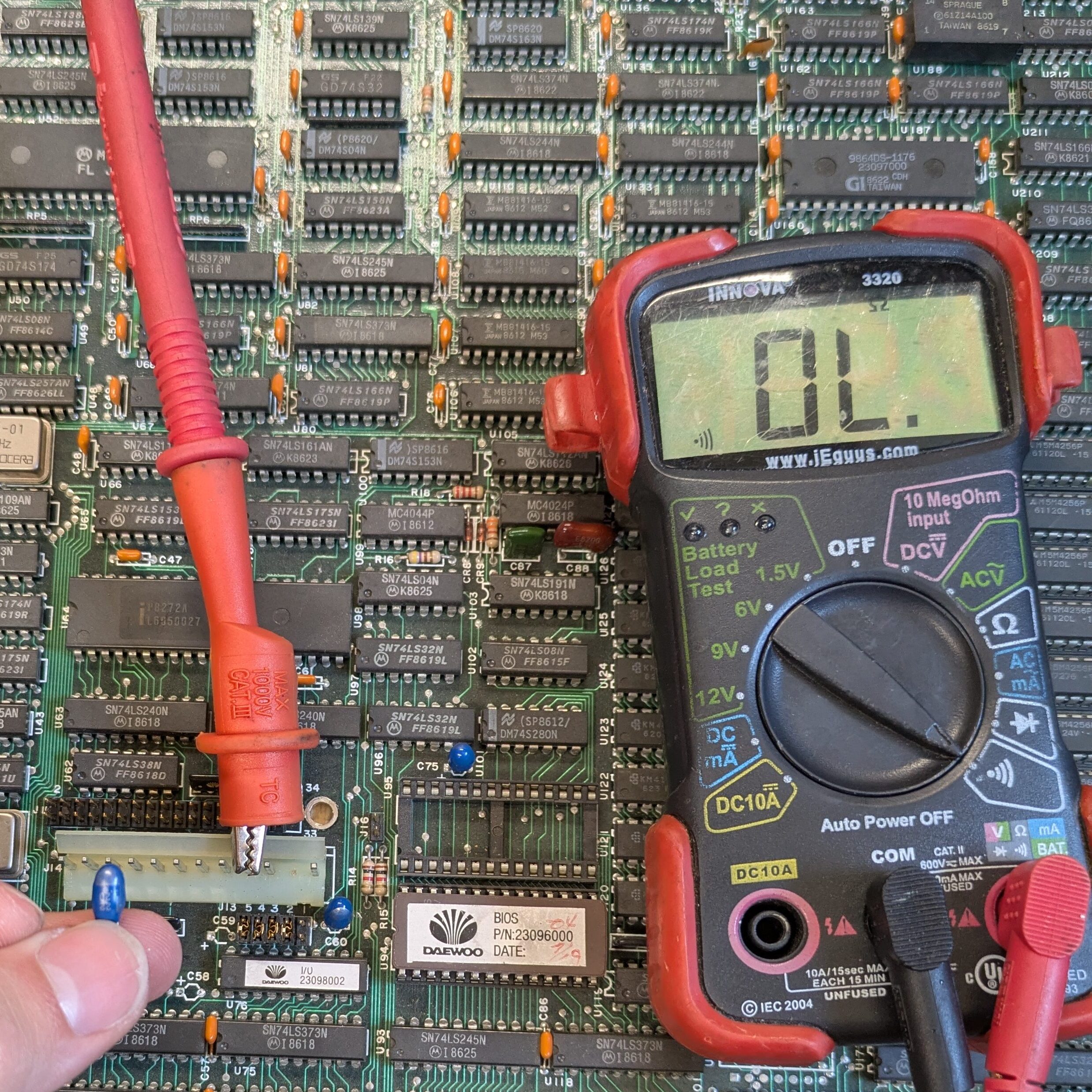 I investigate more into this, and found another forum post pertaining to the IBM 5150, which like this computer, features blue tantalum capacitors on the motherboard, which are prone to shorting out. There’s ones right near the power connector – that’s probably it, no?