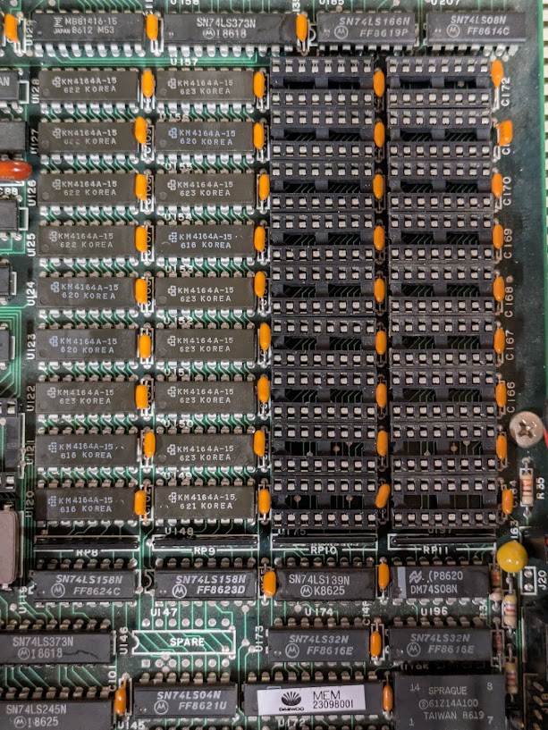 Now, the tricky part is this – one would normally be tempted to think there is a fault at exactly 155K here, but this is not true. I’ve now learnt that these boards feature two banks of 64K of soldered-on RAM, followed by two banks of 256K socketed RAM. When removing the latter two larger banks and leaving the system with 128K, the same issue happens! So, the fault simply cannot be past 128K.