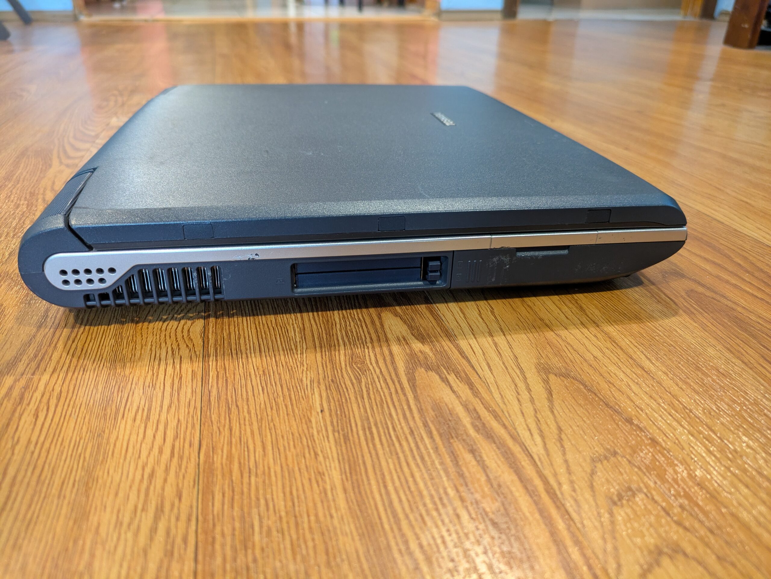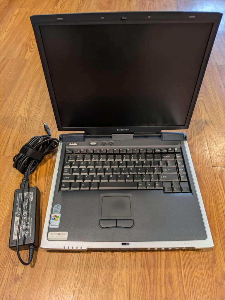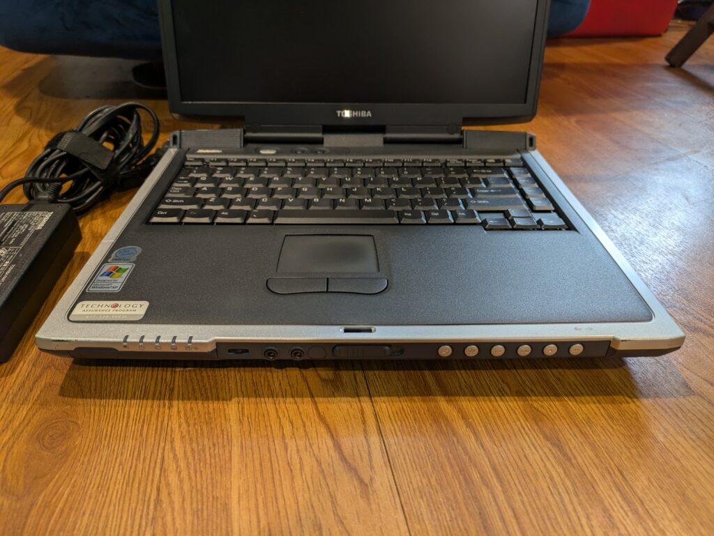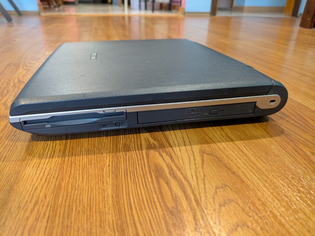 This is a nice chunk of a laptop! Its design is quite elegant I think, and it certainly stands out from a lot of other laptops I’ve seen of the era. It doesn’t just look like a big boring brick, thanks to the silver lining, the speaker placement, and how the screen hinge positioning makes it look like the screen sort of levitates off of the base! I think it’s quite a forward-thinking design in spite of the fact it’s from 2002!